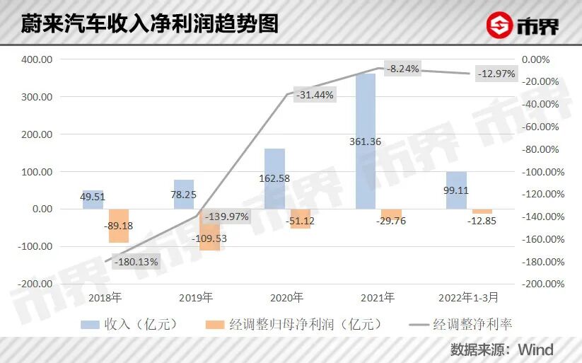 Wind数据显示,蔚来汽车2021年和2022年一季报收入分别为361.36亿元和99.11亿元,经调整的归母净利润分别为-29.76亿元和-12.85亿元,相比2018年至2020年,亏损幅度有明显收缩。