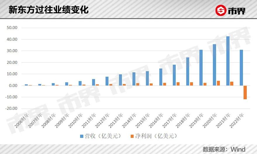 2022财年,是新东方自上市以来,头一次出现营收同比增速为负,及净利润亏损。根据财报,其营收同比下降了27.39%至31.05亿美元,净利润同比下降了455.16%至-11.88亿美元。