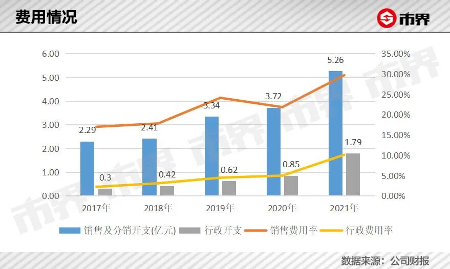 2017年到2021年,朝云集团销售费用从2.3亿元上涨至5.3亿元,销售费用率也从17%上升至30%左右。2021年,公司销售费用中电商渠道营销费用增长了近9400万元。