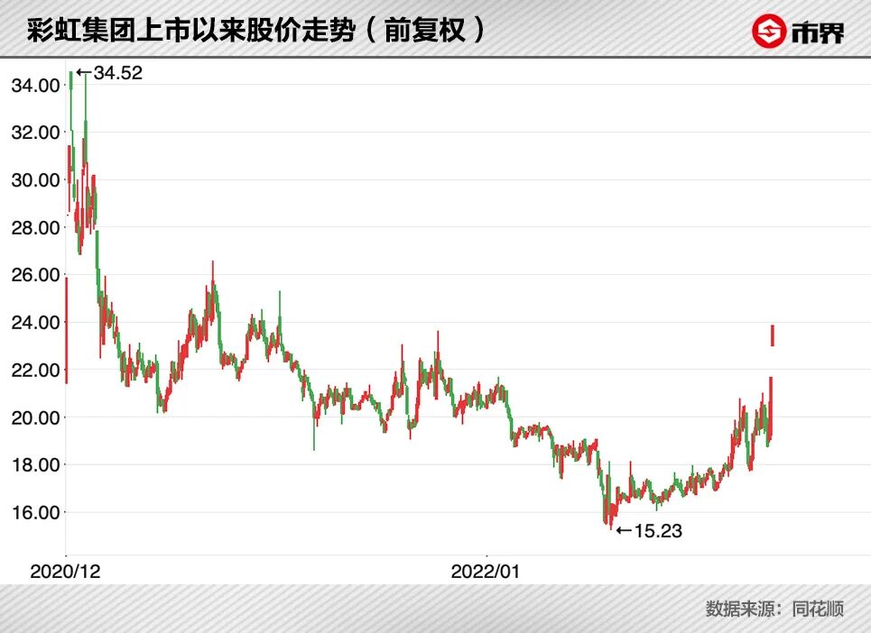 以资本市场的反馈来看,在上市后,彩虹股价最高触及每股34.52元。在此轮连续涨停开启前的9月20日,其收盘价为每股19.7元。跌幅超过40%。