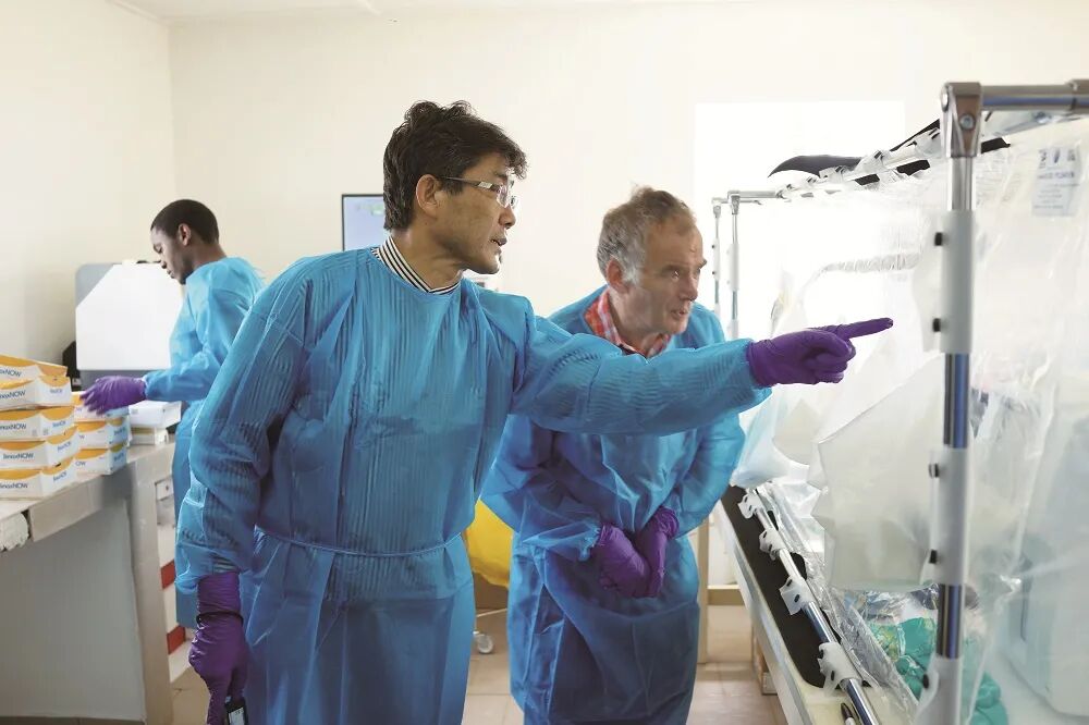 ·2014年,高福(中)在非洲抗击埃博拉病毒期间,同英国专家一起在实验室进行指导工作。