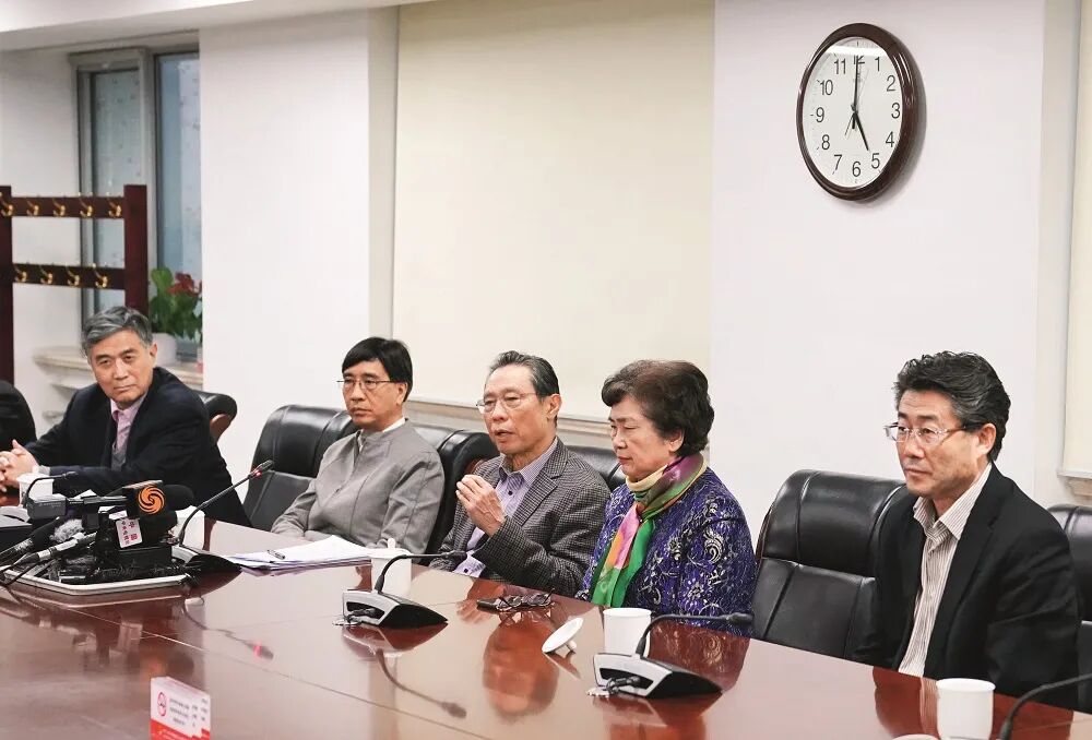 ·2020年1月20日,针对“新型冠状病毒感染的肺炎疫情”有关防控情况,国家卫健委高级别专家组在北京回答记者提问 。从左至右为:曾光、袁国勇、钟南山、李兰娟、高福。