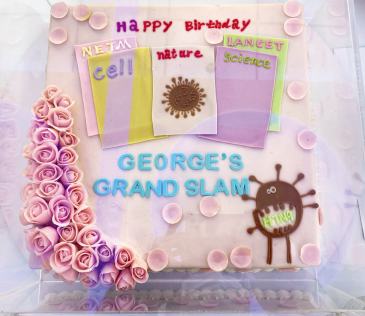 ·高福的学生为他做的生日蛋糕,上面的“封面”代表团队在《自然》《科学》《细胞》《柳叶刀》《新英格兰医学》等世界顶级科学与医学杂志发表的文章。(本刊记者 侯欣颖/摄)