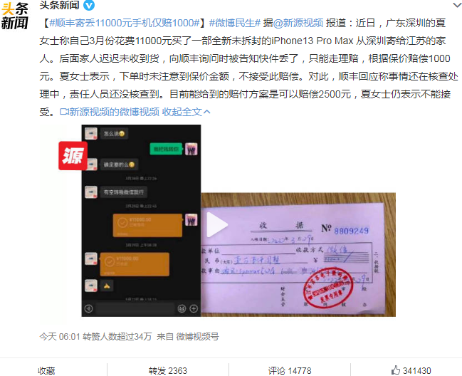 顺丰又一次被推上了风口浪尖。近日,杭州萧山的小刘在顺丰下单了一个同城急送的业务,把20克黄金送到住在拱墅区的一位客户住处。小刘特意进行了保价,保价金额8000元,不料黄金丢了,顺丰客服工电话表示“愿意赔付2000元”,小刘当即表示不接受...相关话题#顺丰寄丢20克黄金保价八千只赔两千#冲上微博热搜榜榜一,引发网友们的热议。 据悉,杭州萧山的小刘在中秋节当天用顺丰下单了一个同城急送的业务,把20克黄金送到住在拱墅区的一位客户住处。20克黄金,目前市场价值约8000元,为防止意外,小刘特意进行了保价,保价金额8000元,不料2小时候快递员打电话说黄金丢了。小刘打电话给顺丰官方客服时,对方表示“的确是快递员丢失了,会有赔付的”,小刘也就暂时放下了心。 然而没想到的是,事情一波三折。9月11日,小刘接到了顺丰官方客服工作人员打来的电话,对方表示“愿意赔付2000元”,小刘当即表示不接受,当询问对方为何不按保价来赔,对方并未有回应,只表示会向理赔部门进一步反馈,但后续他也没有接到顺丰的反馈电话。 界面新闻也就此事向顺丰同城核实,该公司回应称,9月10日发生此事之后,顺丰同城已第一时间协助客户报警,同时进入客服理赔流程,9月13日已按照8000元的保价金额全额先行赔付到账。 此外,顺丰同城也同步了该事件的最新进展:经过警方调查寻找和各方配合努力下,客户遗失的黄金已经找到。 值得注意的是,就在前几日,广东深圳的夏女士花11000元买了一部全新未拆封的iPhone13 Pro Max 从深圳寄给江苏的家人。后面家人迟迟未收到货,向顺丰询问时被告知快件丢了,只能走理赔,根据保价赔偿1000元。随后顺丰回应称事情还在核查处理中,责任人员还没核查到。目前能给到的赔付方案是可以赔偿2500元,但是夏女士仍表示不能接受。 对此,网友们有话说了:“既然保价了,就必须原价赔偿,还要有违约金,这也是一种合同行为”、“是丢了还是监守自盗了呢”、“我之前用京东快递,把我的材料搞丢,问我这些东西值多少钱,我说1000,人家马上就转过来了。也没保价,直接就赔付了”、“之前说别人没保价,所以赔的少,这次保价了,我看还怎么洗,是不是又有些新鲜的去污渍方法”... 据天眼查App显示,顺丰存在数百条法律诉讼信息,其中,运输合同纠纷、服务合同纠纷、财产损害赔偿纠纷等占总数近一半。那么,对于该事件大家怎么看? —【 THE END 】—