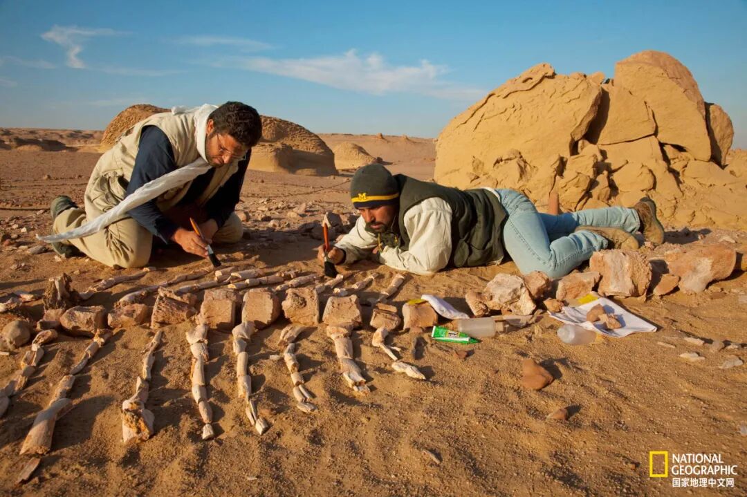 鲸之谷管理员队长Mohammed Sameh(左)和密歇根大学的博士后Iyad Zalmout一起重新拼合一具矛齿鲸的骨架。