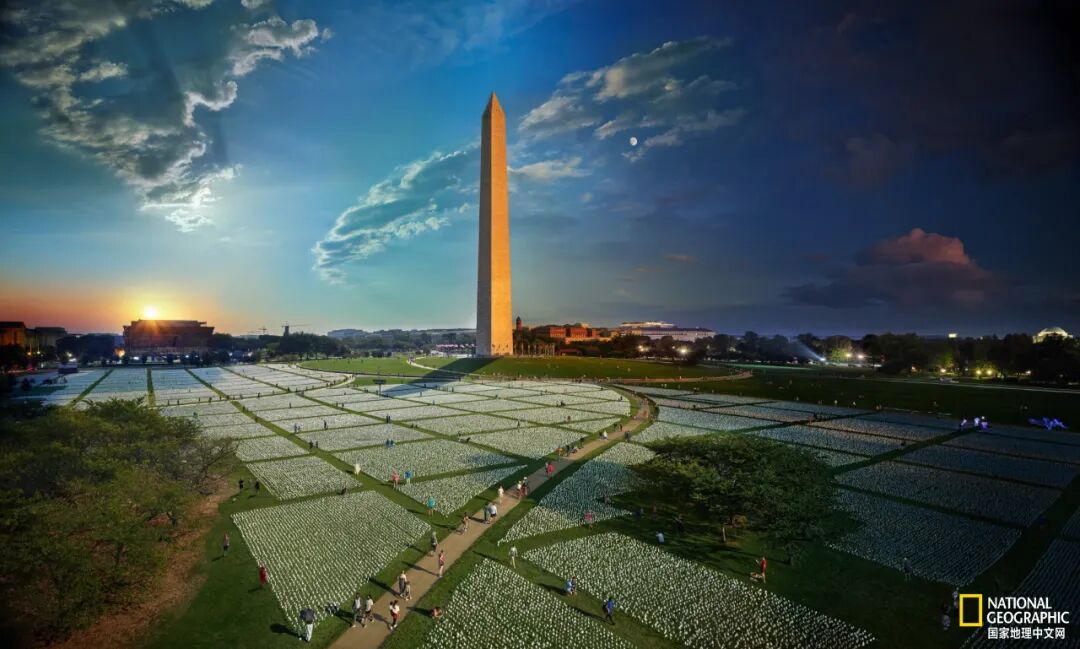 2021年9月,超60万面白色小旗被插在华盛顿纪念碑周围的绿地上,它们是对美国每个死于新冠肺炎者的哀悼与象征。这个装置由艺术家Suzanne Brennan Firstenberg设计;而在该装置展出的约3周时间里,美国的新冠肺炎死亡人数突破了70万。