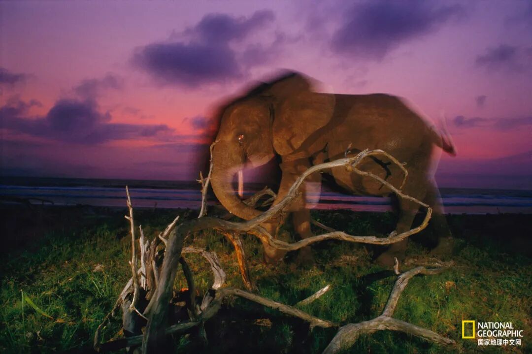 一只森林象沿着加蓬西南部海岸散步。摄影师Nick Nichols在非洲探险的途中,拍下若干激动人心的照片,引起当地政府对于野生动物的重视,更加珍贵的是,那些作品促使加蓬政府于2002年建立了13个国家公园。
