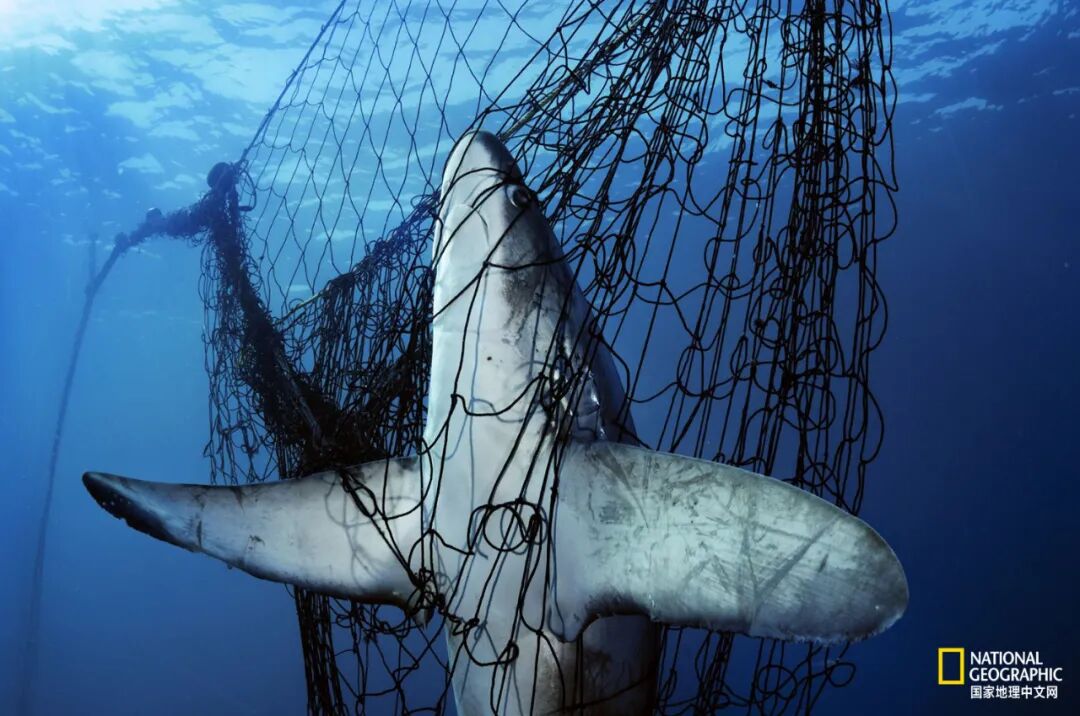 2005年,Brian Skerry拍摄下这张照片——一条浅海长尾鲨在墨西哥加利福尼亚湾被渔网捕获,生命垂危。那时候,每年约有4000万条鲨鱼因鱼翅贸易被捕杀。尽管,美国水域已禁止割取鲨鱼鳍,但随着更多的鱼翅需求,这样的现象还是屡见不鲜,甚至有增长趋势。如今,每年仍有多达1亿条鲨鱼被杀。