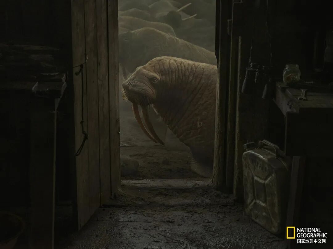 摄影师Arbugaeva在一篇文章中写道:"当我们被海象包围时,小屋都在颤抖。" 作为俄罗斯北极地区的土著人,Arbugaeva回到家乡,与一位海象研究员一起在小木屋中住了两周。其中三天他们都被困在里面,小心翼翼地活动,以免引起周围大约10万只海象的恐慌。