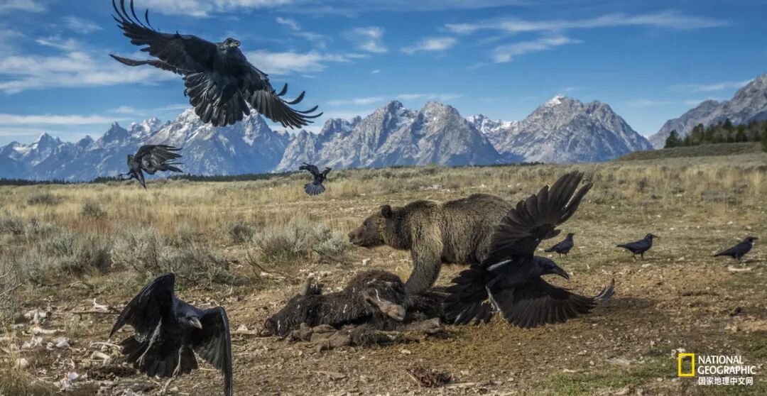 在20世纪,灰熊的处境是极其危险的。由于捕猎与栖息地丧失,60年代时,它们的数量减少到只有600只。后来,在《美国濒危物种法案》的保护下,情况有所好转——直到2010年代,已有近1000头灰熊在黄石地区生活。比如,Charlie在大提顿国家公园捕捉到的这头,它正在吞食美洲野牛尸体。