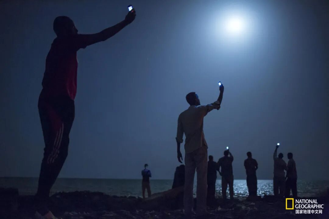 2013年起,作家Paul Salopek开启了漫长的徒步之旅,他步行3.4万公里,穿越四大洲,寻找6万年里的人类移民的轨迹。摄影师John Stanmeyer陪同Salopek踏上了旅程的第一段,拍下了挤在吉布提海岸上的索马里移民,他们正试图捕捉手机信号。