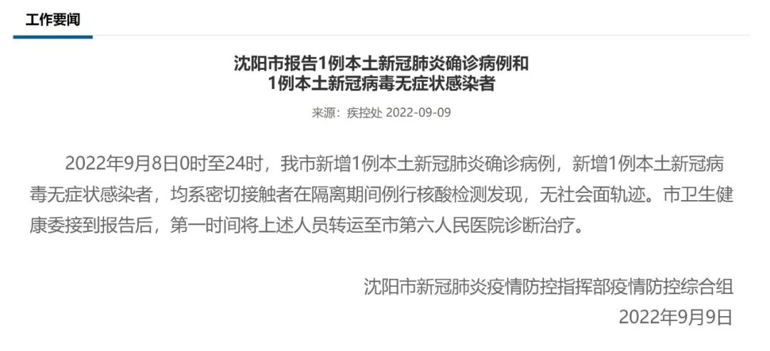 沈阳市报告1例本土新冠肺炎确诊病例和