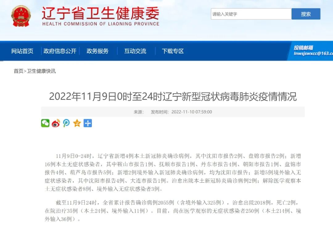 11月9日0-24时,辽宁省新增4例本土新冠肺炎确诊病例,其中沈阳市报告2例、盘锦市报告2例;新增16例本土无症状感染者,其中鞍山市报告1例、抚顺市报告1例、丹东市报告4例、朝阳市报告1例、盘锦市报告4例、葫芦岛市报告5例;新增2例境外输入新冠肺炎确诊病例,均为沈阳市报告;新增5例境外输入无症状感染者,其中沈阳市报告4例、大连市报告1例。治愈出院本土新冠肺炎确诊病例2例;解除医学观察本土无症状感染者8例、境外输入无症状感染者3例。