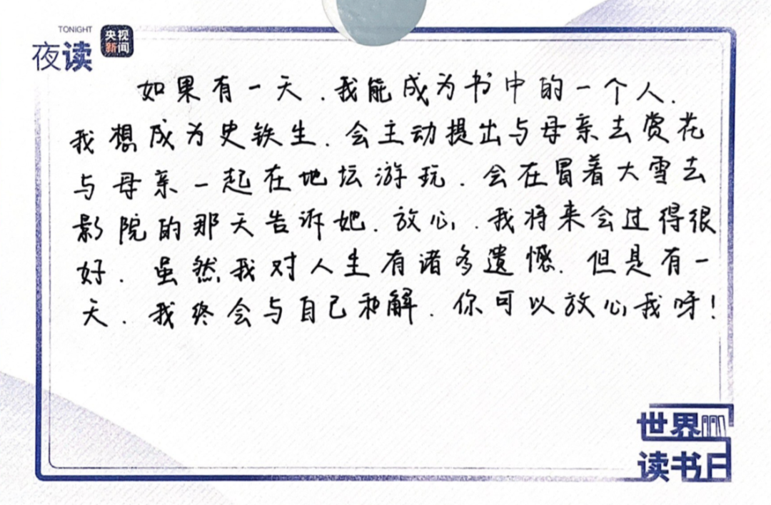 会主动提出与母亲赏花,与母亲一起在地坛游玩,会在冒着大雪去影院的那天告诉她:放心,我将来会过得很好。虽然对人生有诸多遗憾,但是有一天,我终会与自己和解,你可以放心我呀!