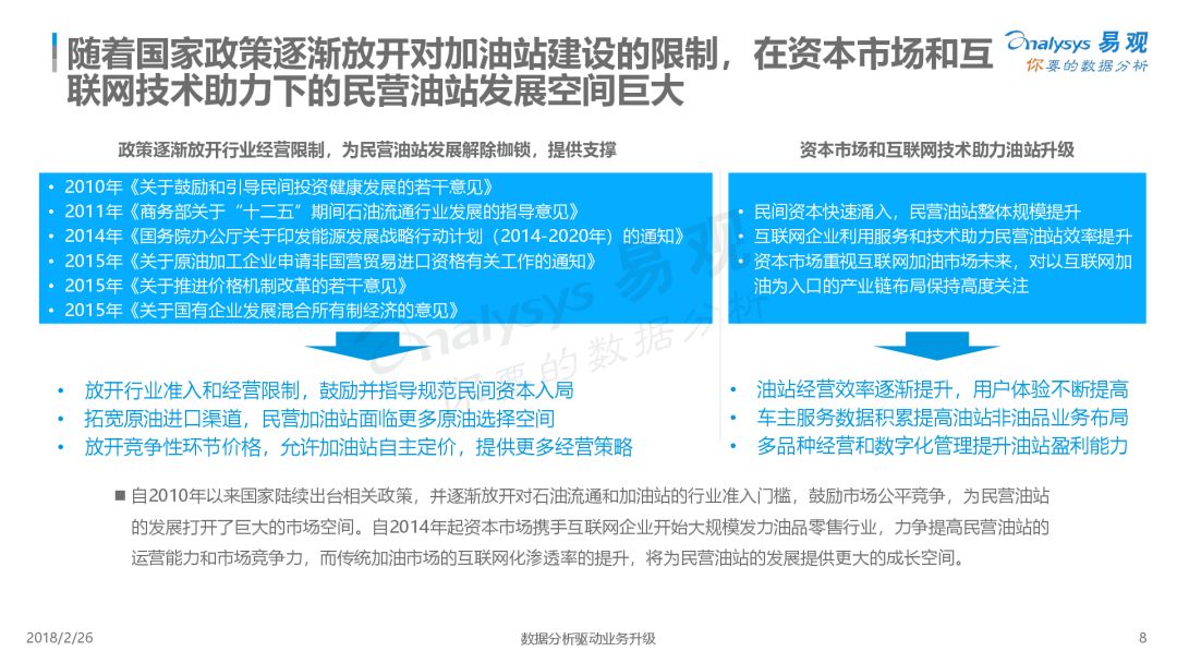 自2010年国家相关政策陆续出台以来,放开了行业准入和经营限制,也给了民营加油站更多的自主空间。2014年,资本市场和互联网技术大规模进入油品零售行业,也将民营油站的运营能力和市场竞争力提升了一个高度。与此同时,“互联网+”的模式创新提供了新的营销、交易方式,油站的服务质量发生了极大的变革,向实现企业管理、用户服务的全面互联网化迈进了一步。