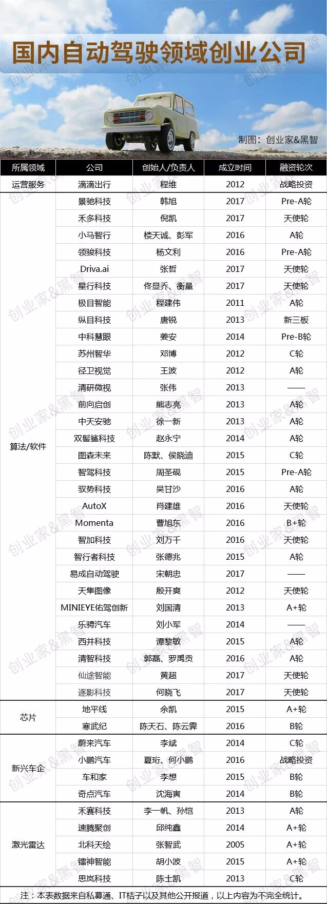创业家&黑智统计的国内自动驾驶领域的创业公司