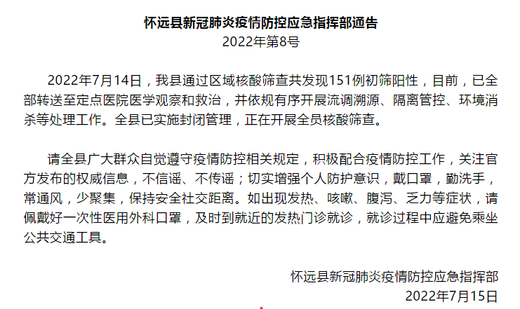 7月15日,怀远县疫情防控指挥部发布《关于在全县范围内实施封闭管理的通告》: