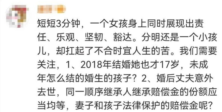 博主开门见山问:“你(那么早)结婚,是冲动型吗?”小陈表示,“不是(冲动),就是只要不读书,就有人跟你相亲。”博主问起了小陈的另一半,她表示,2019年丈夫已经因为车祸去世。这个答案再次震惊了博主。小陈介绍,当时女儿只有五六个月大,丈夫去世后不到一个月,她的婆婆拿到了赔偿金,便将她和女儿赶走了。“在江西那边延续只能是儿子,女儿不算。”说到丈夫去世尚且能一笑而过的她,讲到这时把口罩戴了回去,眼里含着泪,时不时低下头。博主一时不知道怎么接话,只能泛泛地感叹一句“真不容易啊”。但小陈的语气又好像轻松起来:“这有什么不容易的,现在不吃苦什么时候吃苦啊,对不对?才21岁,正是吃苦的时候。”刚开始送外卖时,小陈把半岁的宝宝背在胸前。后来孩子稍微大一点,白天可以暂时留在出租屋里或是托人照料,晚上再母女一块出来跑单。博主忍不住问,那要遇到没电梯、需要爬楼的单子怎么办?“年轻人不爬楼谁爬楼啊?”小陈说着,自己忍不住笑了起来。小陈表示,自己之所以离开江西老家,来到安徽安庆工作,是因为父母不同意自己带着孩子,“因为你(才)21岁,以后可能有更好地生活。”但她坚定地表示,自己不是这么想的,“我既然生下她,肯定要负责任的呀。”话锋一转,小陈也表示理解自己的父母:“我妈妈是为了我好,她心疼她自己的女儿,但我也心疼我女儿,她(女儿)在都是我想过的生活。”小陈表示,自己这两年遇到了很多好心人。自己送外卖不能照顾女儿时,会把女儿放在一家熟识的麦当劳店里,工作人员“对她(女儿)很照顾”。被问及现在的打算时小陈说,要挣钱把孩子养大,上大学,“不能像我一样那么早就结婚吧。”她说自己的短期愿望是“买个小房子,小小的就行,她(女儿)能跟我住一起就行”。说话时,她的眼睛亮晶晶的,满是笑意。博主夸奖,“太伟大了,为母则刚”,小陈点点头,想了想又补充道“不过硬扛”。聊天结束时,博主想给孩子一个红包,但小陈微笑着却坚定地拒绝了:“这是个人的底线,你不能触碰我的底线,这我真不要。”评论中获得最高赞的网友表示,自己就是安庆的,对这个女孩子印象深刻,“前两年上班的时候,下午茶点瑞幸就是她送来的,当时她背着个好小的宝宝,我们整个售楼部都震惊了……后来有次晚上十点多跟朋友吃麦当劳,又看到她背着孩子取餐……”这条侧面证明小陈带着女儿送外卖真实性的评论,也让很多网友释然:“之前看到这段视频非常感动,但多机位的拍摄又让我生怕是自媒体在编故事,现在安心了。这片土地真正的希望就是和这位女孩一样的那部分普通人。”有人则表示十分心疼小陈,“21岁哪里是应该吃苦的年纪。”有人说,“不管是个人选择还是迫于无奈没有在读书,她都是一个自信勇敢善良的女生”,并直言,小陈面对困难的做法和心态,比大多数人强太多了。网友们感叹“生活的苦难与不公没有压垮她,反而更加坚韧地去直面生活”,小陈的落落大方也让不少网友赞叹,有人也表示,“她越这样越让人觉得难过,不过这样努力生活的人应该也不需要别人的同情。”还有很多法律意识较强的网友,就“婆婆拿走全部赔偿金”一事提出质疑,认为婚后丈夫意外去世,同一顺序继承人继承赔偿金的份额应当均等,更何况小陈还有一个小婴儿要照顾,是否可以通过法律援助去争取一下赔偿金。对于这一点,小陈在后续视频中也有回应:婆婆年纪大了,还有个十几岁的孩子,“她也失去了一个儿子啊”。她表示,婆婆现在会“隔几个月给点钱之类的”,“我现在还年轻,我感觉我能养得起我女儿。”记者致电当地妇联询问相关情况。工作人员称,已经了解过这件事,并且去看望了小陈,具体内容不方便透露。视频中,小陈身穿顺丰同城急送的工作服。记者联系到顺丰同城公关部门负责人,该负责人表示,公司给予她个人一些物质上的资助,她都没有接受,已邀请她作为公司的公益大使。小陈本人拒绝了采访。上述负责人征求她的意见后回复说,她目前不想接受采访,只想好好跑单,“可能是觉得目前还没到那个地步。”小陈一直在自己的社交账号上分享和女儿的生活日常,第一个视频于2021年5月发布,已有粉丝14.2万,近几条视频获赞均过万。在最新的视频中,她配文称:“一次偶然的机会,让我得到很多网友的鼓励跟关心,只管努力,其他的就看天意”。她还表白自己的女儿:“只要女儿不受欺负,幸福快乐我就值得,世界很大,幸福很小,没有非常好的条件给你,但我尽量让你过得好,保护你。 ”有事找记者
