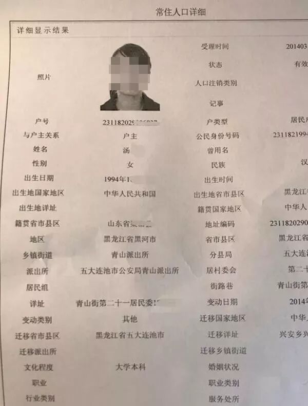 户籍资料显示,汤玉于2014年3月迁移户籍至五大连池市公安局青山派出所,个人独立一户。迁户原因为,其他。