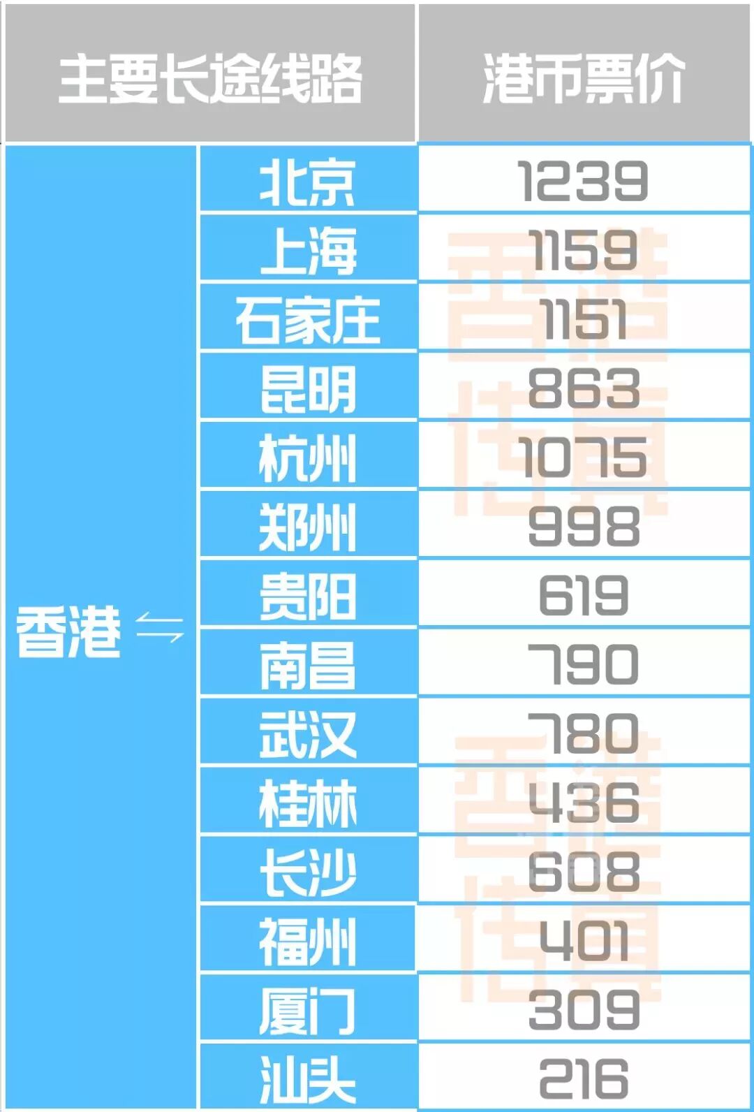 至京广线、杭福深线、沪昆线和贵广线上的长途站点的直达列车二等座票价,最高票价分别为至北京的1077元人民币(约1239港币)、福州的349元人民币(约401港币)、上海的1008元人民币(约1159港币)及贵阳的538元人民币(约619港币)。香港方面的票价每个月会根据上个月的汇率情况进行调整。