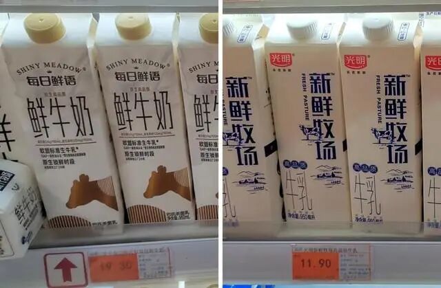 原先将近15元的光明新鲜牧场,如今只要11.9元,相当于每100毫升只要1.24元。原先将近25元的蒙牛每日鲜语,现在售价为19.3元,约等于打了七七折。