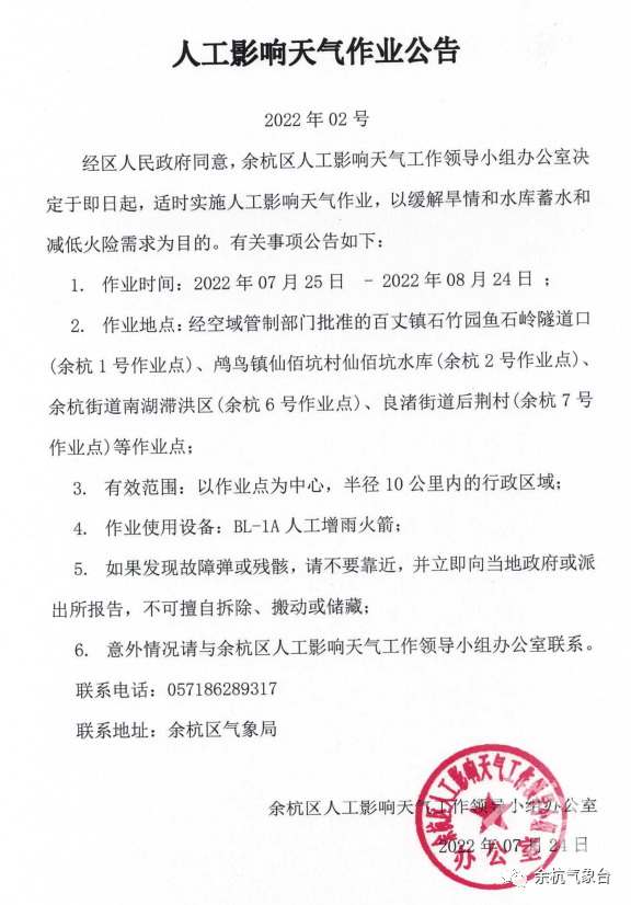 不过有一个好消息,余杭区气象局将从明天(7月25日)起,抓一切有利条件开展人工增雨作业,缓解旱情。