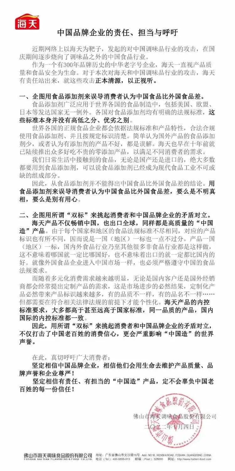 海天味业称,海天产品的内控标准要求大多都高于甚至远高于国家标准,同一品质的产品,国内国际的内控标准都一致。“用‘双标’挑起消费者和中国品牌企业的矛盾对立,不仅打击了中国老百姓的消费信心,更会影响‘中国造’的世界声誉。”海天味业在声明中呼吁消费者;“坚定相信中国品牌企业,相信他们会用生命去维护产品质量、品牌声誉和企业尊严。”