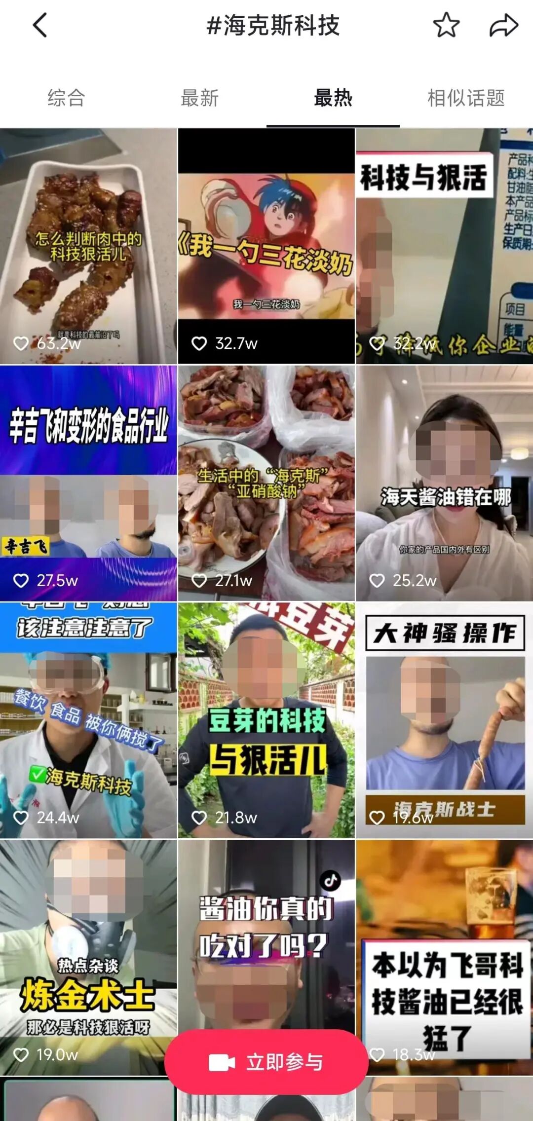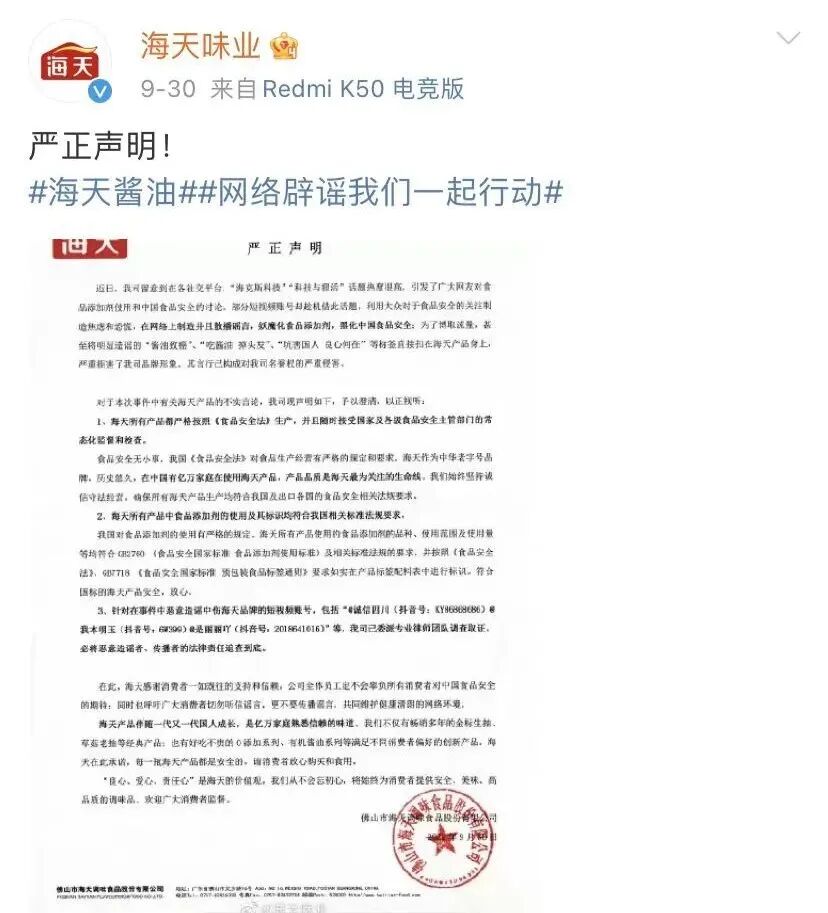 值得一提的是,此前部分短视频指出海天味业的酱油是“海克斯科技食品”。对此,9月30日,海天味业曾发布声明,称公司产品所含的食品添加剂符合国家标准以及法规要求。海天味业还表示,部分短视频账号利用大众对于食品安全的关注制造焦虑和恐慌,在网络上制造并且散播谣言,严重损害了公司品牌形象,其言行己构成对公司名誉权的严重侵害。针对在事件中悉意造谣中伤海天品牌的短视频账号,公司己委派专业律师团队调查取证。