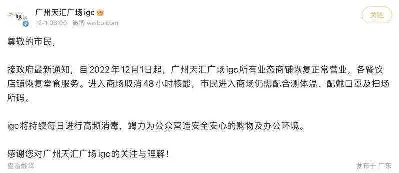 早上8点,广州天汇广场官方微博发布消息:接政府最新通知,自2022年12月1日起,广州天汇广场igc所有业态商铺恢复正常营业,各餐饮店铺恢复堂食服务。进入商场取消48小时核酸,市民进入商场仍需配合测体温、佩戴口罩及扫场所码。