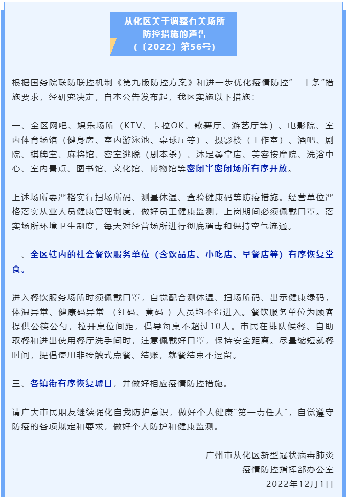 12月1日,广州市从化区发布通告称网吧、娱乐场所、电影院等密闭半密闭场所有序开放,有序恢复堂食。