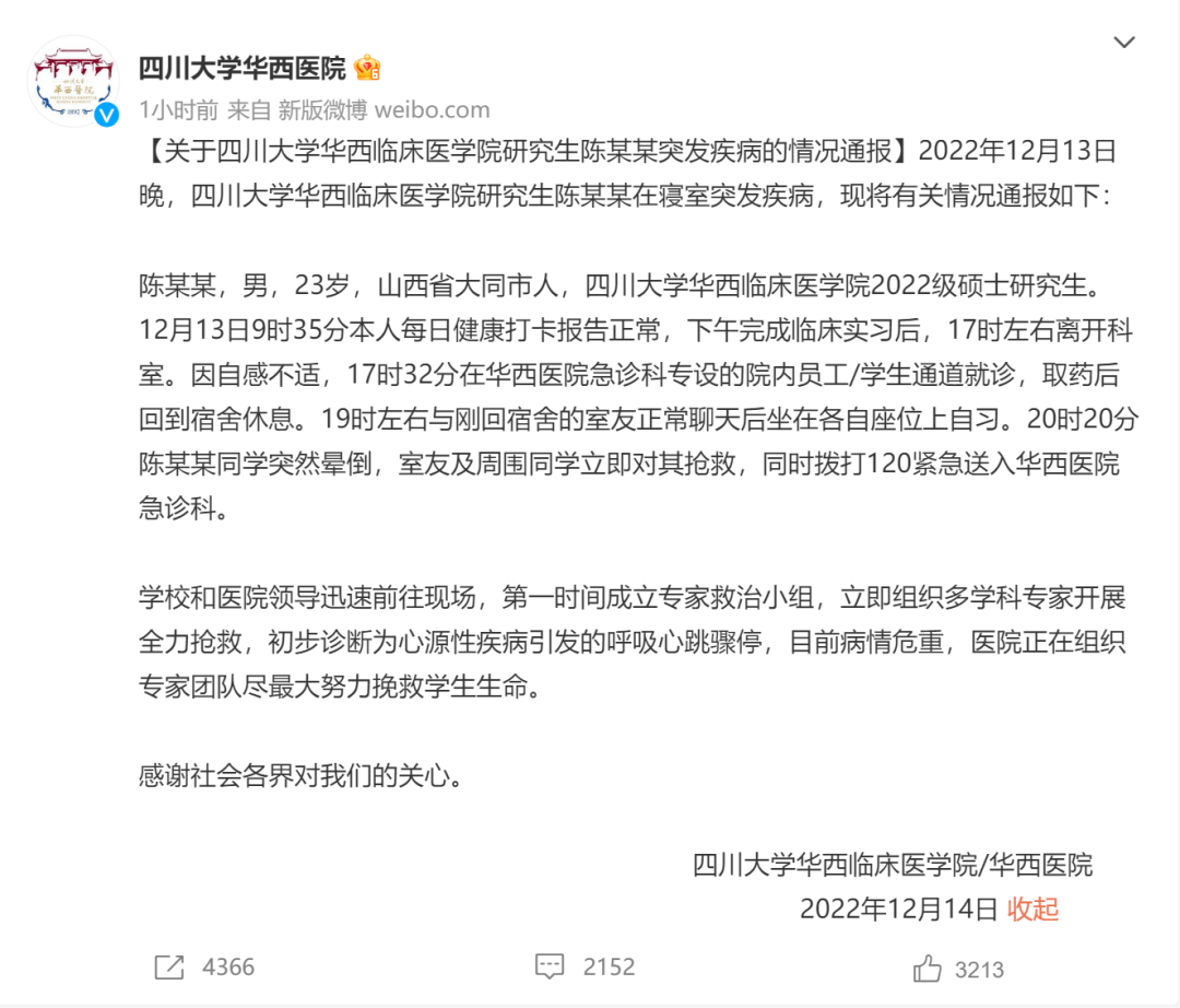 2022年12月13日晚,四川大学华西临床医学院研究生陈某某在寝室突发疾病,现将有关情况通报如下: