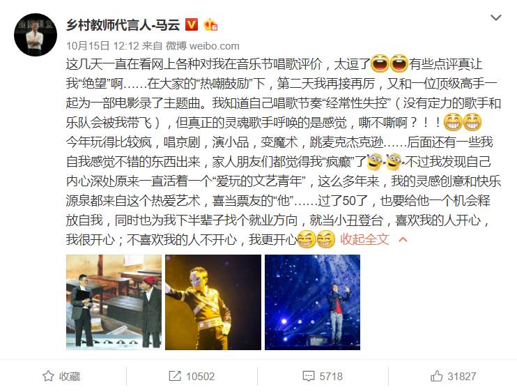 马云微博自称文艺青年 自嘲唱歌后有些评论让其绝望