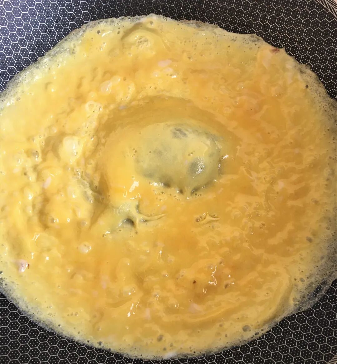 4. 碗中打入两个鸡蛋,搅散。平底锅预热刷油,薄薄的一层即可;倒入蛋液,迅速晃动一下平底锅,将蛋液摊成鸡蛋饼。