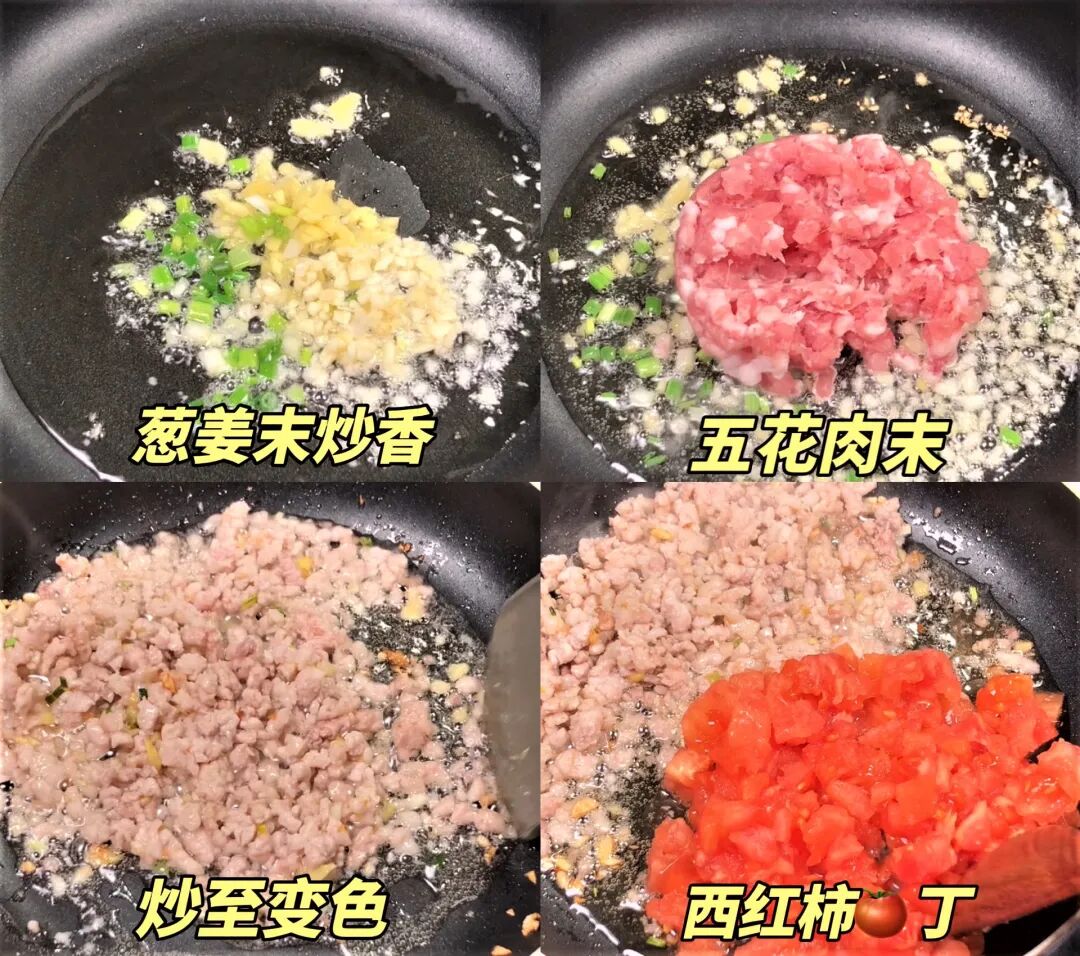 2. 油热放葱姜末炒香,倒入肉末炒至变色、炒香。接着倒入去皮切好的番茄丁,炒出番茄汁。