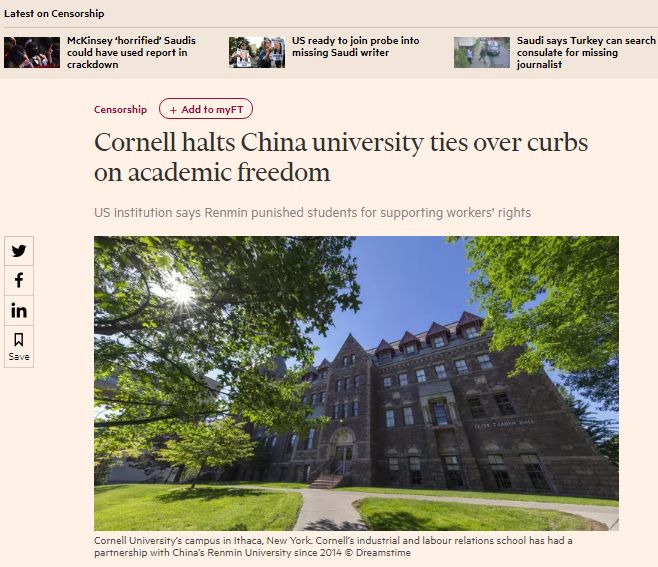 据《金融时报》报道,美国康奈尔大学宣布中断与中国人民大学的交流合作项目,理由是人民大学缺乏学术自由。这被认为是近年来国外大学因政治原因与中国大学中断合作的首例。