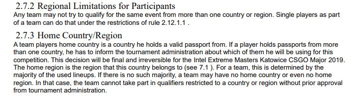 玩家战队的国籍是他们持有有效护照的国籍,如果战队没有有效国籍,则不得参加资格赛。所以显然,“SadStory”就是因为这一条而被取消了比赛资格。
