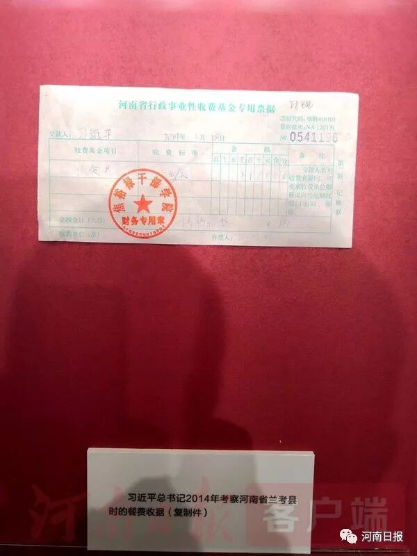 展柜内放着一张单据。仔细一看,原来是一张收据,上面印有“河南省行政事业性收费基金专用票据”的字样,而在这张收据的交款人位置上赫然写着“习近平”。