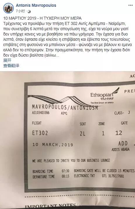 这位幸运儿是非盈利组织国际固体废物协会(ISWA)主席安东尼斯·马夫罗普洛斯(Antonis Mavropoulos)。3月10日,他在脸书以“我的幸运日”为题发表文章称,自己原本要登上失事飞机,但他在登机口关闭两分钟后才抵达,无法登机。他还在脸书中展示了自己的机票。