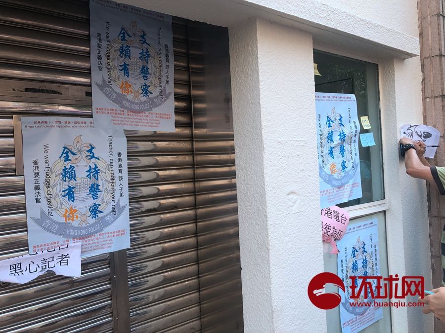 下午16时许,环球时报-环球网记者在广播道的香港电台外看到,上千名爱国群众挥舞国旗,高喊“垃圾电台”等口号,并在外墙贴上“支持警察,全赖有你”的标语。