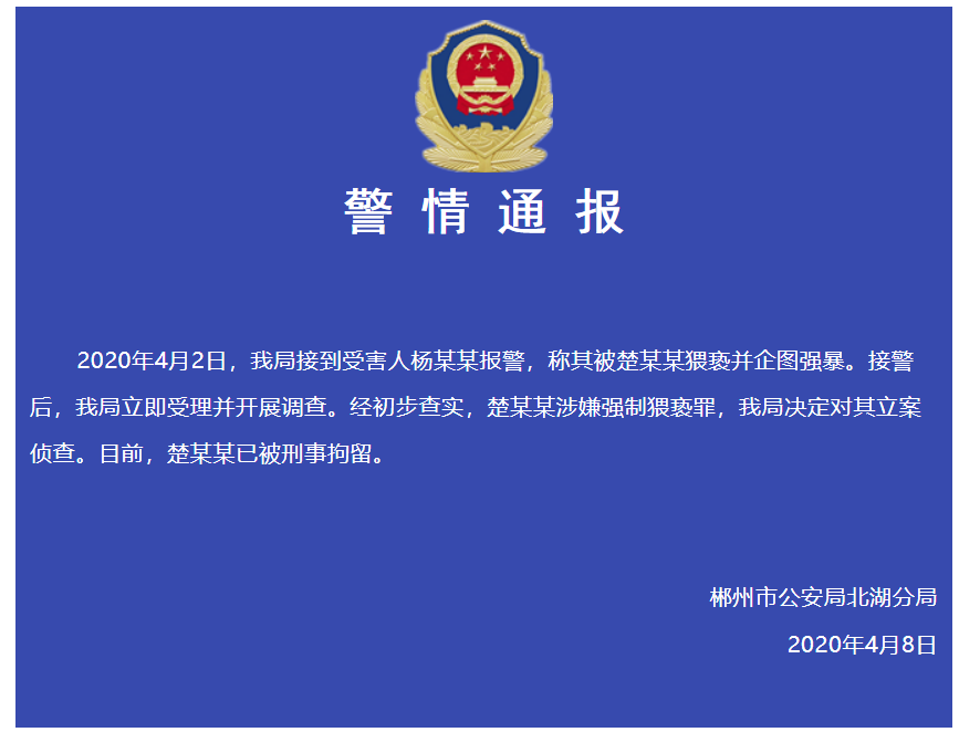郴州市公安局北湖分局:2020年4月2日,我局接到受害人杨某某报警,称其被楚某某猥亵并企图强暴。接警后,我局立即受理并开展调查。经初步查实,楚某某涉嫌强制猥亵罪,我局决定对其立案侦查。目前,楚某某已被刑事拘留。