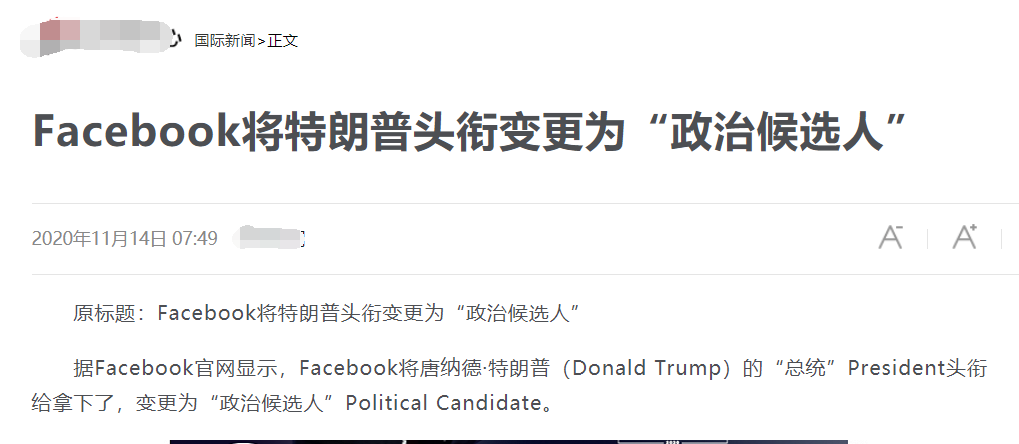 如下图所示,今天上午,一些中国国内媒体报道称美国流行社交网站Facebook近日将美国现任总统特朗普的“总统”头衔给拿下了,只称他是“政治候选人”。