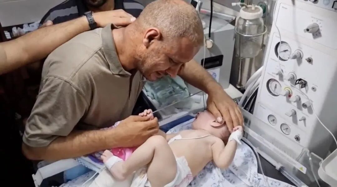 “我亲爱的,我亲爱的,谢谢上帝,谢谢上帝。冷静,亲爱的,冷静。”视频中,父亲轻抚着婴儿,一遍遍地亲吻着婴儿的身体。据报道,这名父亲名叫穆罕默德•哈迪迪,他在加沙市的一家医院中与自己唯一幸存的孩子重逢。