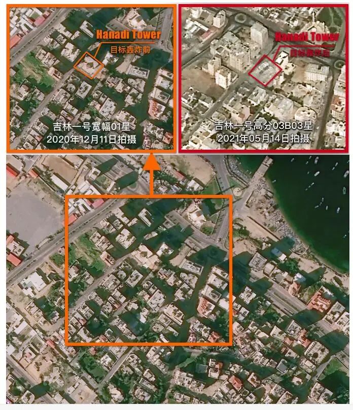 比如下图为吉林一号卫星分别与2020年12月11日(轰炸前)和2021年5月14日(轰炸后)拍摄的加沙地带相同地点卫星影像。对比两张卫星影像可以发现,在巴以冲突期间,加沙地带的一栋多层建筑—哈纳迪塔(Hanadi Tower)被摧毁。