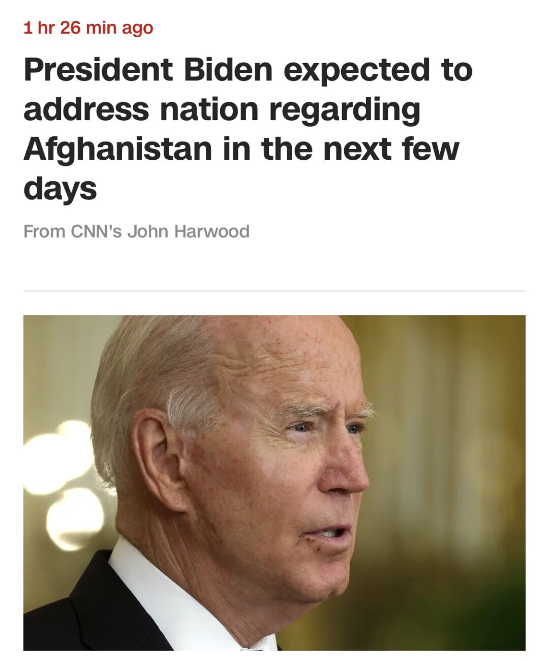 美国有线电视新闻网(CNN)刚刚消息,美国总统拜登预计将于未来几天就阿富汗局势向全美发表讲话。