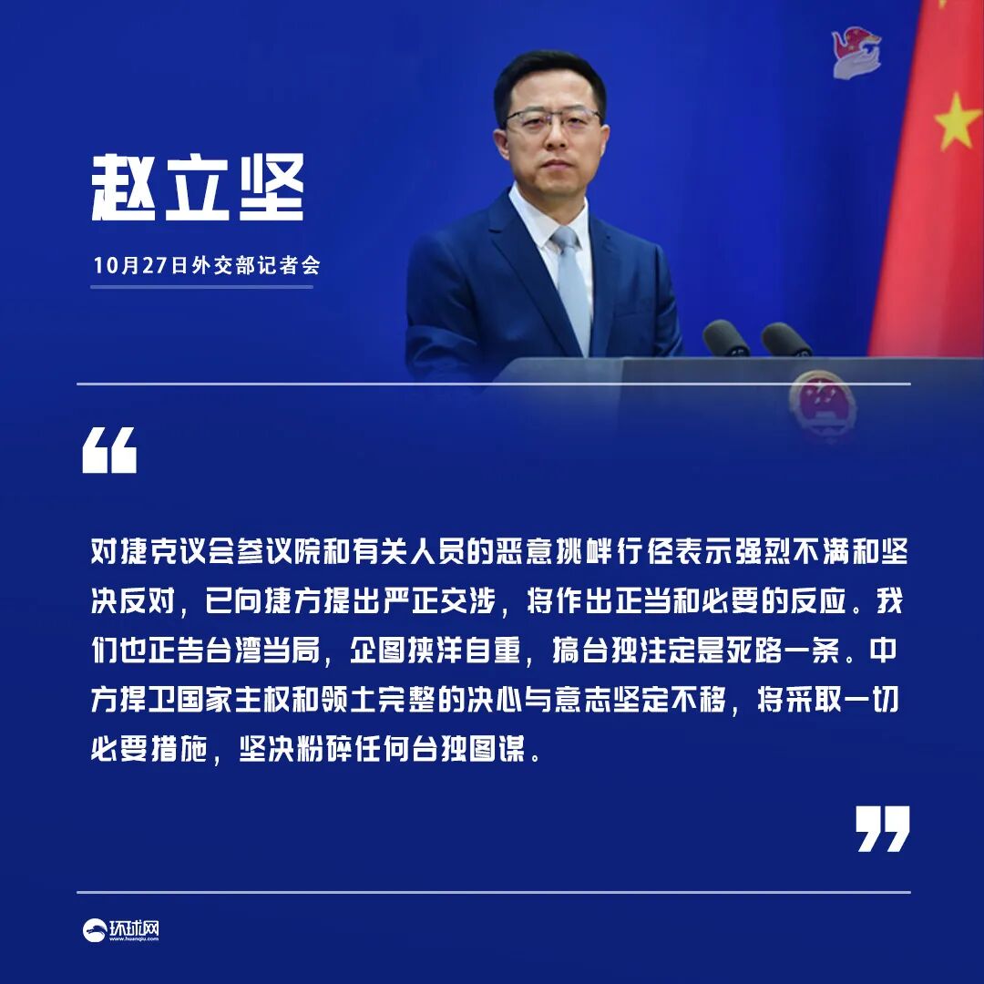 捷克参议院邀请台湾当局外事部门负责人吴钊燮访问捷克。对此,中国外交部发言人赵立坚在27日的例行记者会上表示,中方对捷克议会参议院和有关人员的恶意挑衅行径表示强烈不满和坚决反对,已向捷方提出严正交涉,将作出正当和必要的反应。