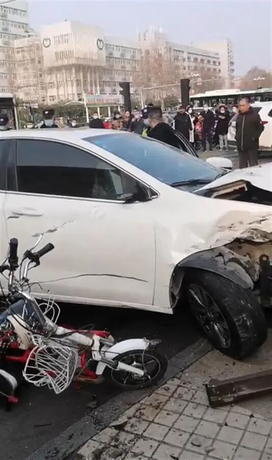 3月20日16时36分,在河北邯郸市一交通路口,便道上骑电动车的市民正在等待通行,一辆白色轿车突然从便道处冲撞过来,将十几位等待通行的市民撞倒。