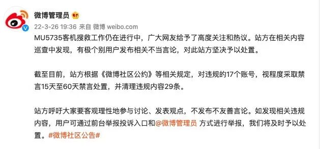 据@微博管理员 通报:MU5735客机搜救工作仍在进行中,广大网友给予了高度关注和热议。站方在相关内容巡查中发现,有极个别用户发布相关不当言论。截至目前,站方根据《微博社区公约》等相关规定,对违规的17个账号,视程度采取禁言15天至60天禁言处置,并清理违规内容29条。