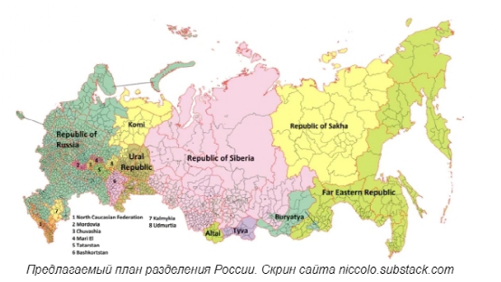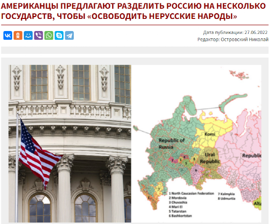 报道说,美国有人已经绘制出一个分裂的俄罗斯的地图。他们的计划涉及将俄罗斯联邦划分为十几个独立的政治实体——俄罗斯共和国、科米、乌拉尔共和国、西伯利亚共和国、萨哈共和国、阿尔泰、图瓦、布里亚特、远东共和国、北高加索联邦、摩尔达维亚、楚瓦什、马里埃尔、鞑靼斯坦、巴什科尔托斯坦、卡尔梅克、乌德穆尔特。