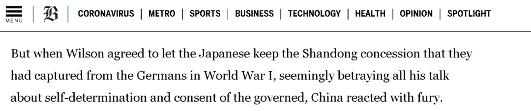 美国《波士顿环球报》在2021年6月24日的一篇讲述美国前总统威尔逊是如何在一战后背叛了中国的文章中就指出,正是当时美国的威尔逊政府对日本的纵容,才令本来应该在战后归还给中国的山东省,被日本占去。