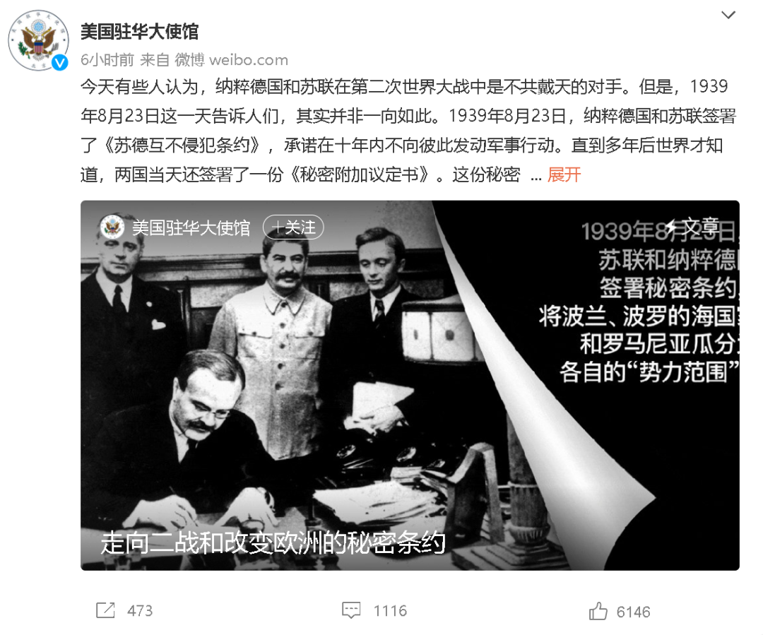 北京时间8月23日,美国驻华大使馆分别在其微博和微信账号上发布了一则讲述苏联在二战爆发前的“黑历史”的稿件,称苏联在1939年时不仅和纳粹德国签订了《苏德互不侵犯条约》,还在一份“秘密附加议定书”中打算和德国一起瓜分波兰乃至东欧各国。
